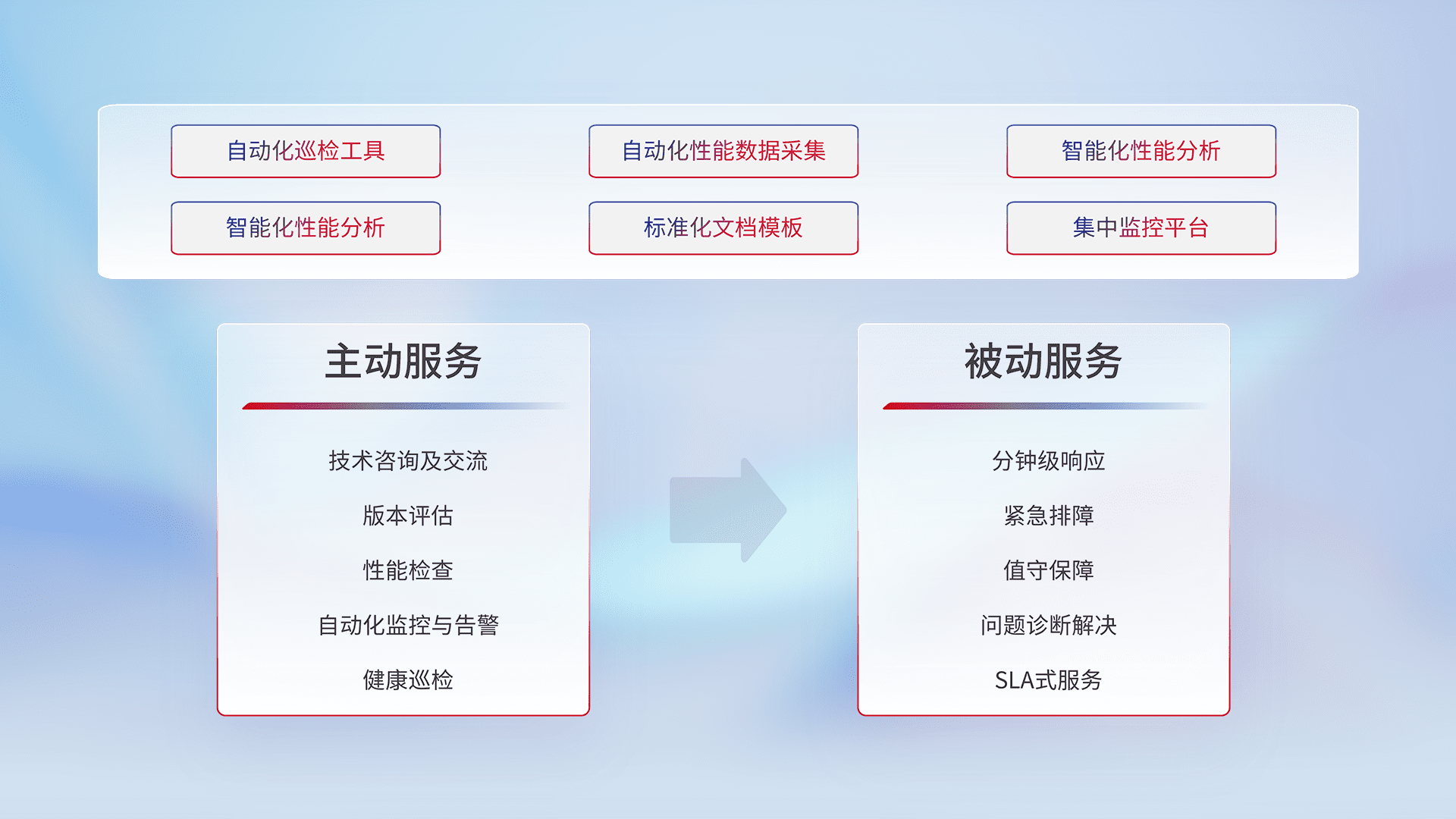 智能化工具和标准化文档,,保障服务质量,,,提供主动服务(包含技术咨询、、、版本评估、、、、性能检查、、、、自动化监控与告警、、、健康巡检)和被动服务包含(分钟级响应、、、、紧急排障、、值守保障、、问题诊断解决、、、SLA服务)。。