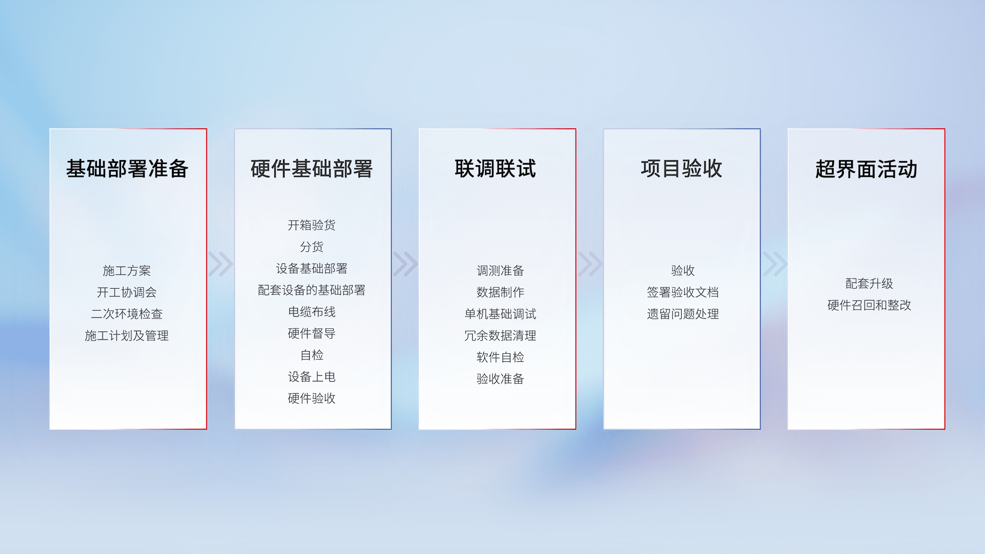 从基础部署准备、、、硬件基础部署、、、联调联试、、、项目验收、、越界面活动的全过程可追溯,,,,保证施工质量和进度。。。